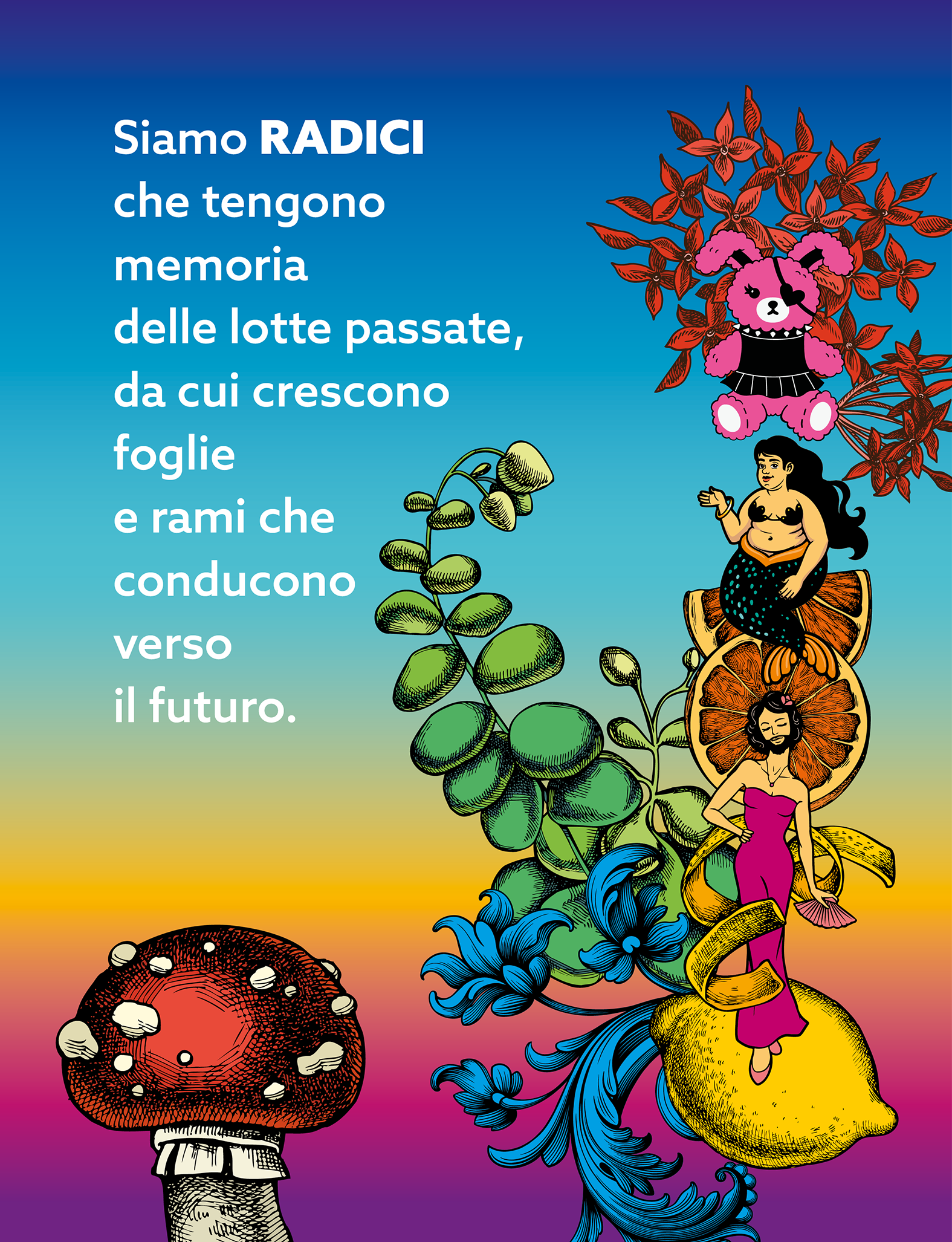 Per riappropriarci del nostro TEMPO e del nostro SPAZIO, abbiamo scelto per il tema di questo LIGURIA PRIDE 25 di ripartire dalla consapevolezza delle nostre RADICI, che ci ricordano che siamo capaci di ESISTERE e RESISTERE, e dal nostro IMMAGINARIO QUEER e TRANSFEMMINISTA, attraverso il quale rappresentiamo quella società che DESIDERIAMO CREARE, opposta al sistema patriarcale e fascista che ci schiaccia.