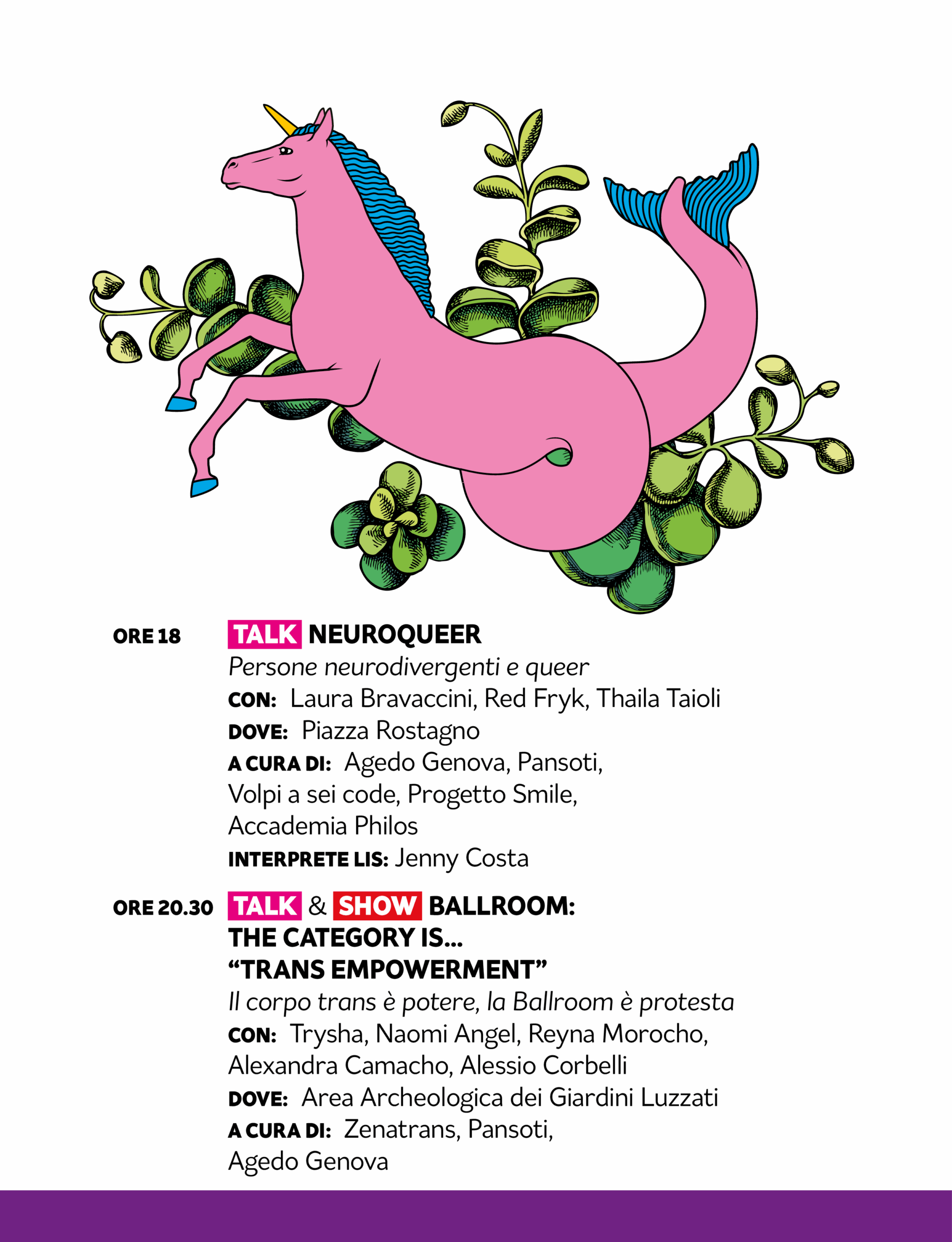 Naomi Angel | Chiara Becchimanzi | Daria Bignardi | Boyrebecca | Simona Bonsignori | Laura Bravaccini | Matteo Botto | Giorgio Umberto Bozzo | Danilo Caiano | Celeste | Marianna Coppola | Carlotta Cossutta | Giulia De Rocco | Red Fryk | Khalab | Viola Lo Moro | Sara Lucaroni | Ma Nu |Barbara Mapelli | Annagaia Marchioro | Giuseppe Masullo | MĪMĪ x FY | Reyna Morocho | Simonetta Musitano | Silvia Neonato | Eugenia Nicolosi | Gigi Niri | Playgirls from Caracas | Mariella Popolla | Massimo Prearo | Rete Nazionale Educare alle Differenze | Samuel | Thalia Taioli | Luca Trapanese | Trysha | Carlotta Vagnoli | Vale LP & Lil Jolie | Valuh | Federico Zappino